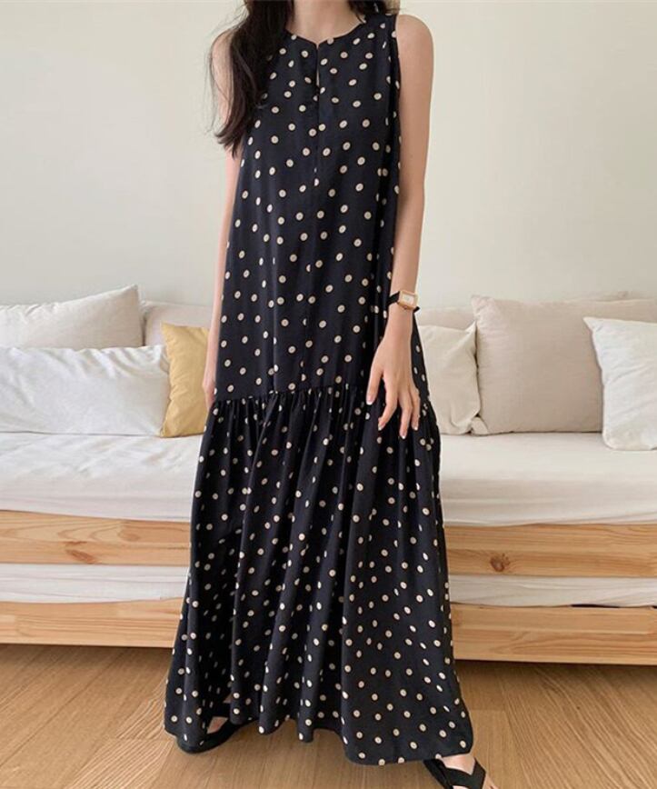 お取り寄せ/2色 韓国 上品 ラウンドネック ノースリーブ 夏 ロング丈 夏ワンピース 夏 海 かわいい おしゃれ お洒落 楽 デート シンプル 女子会 20代 30代 40代 50代 | anje17